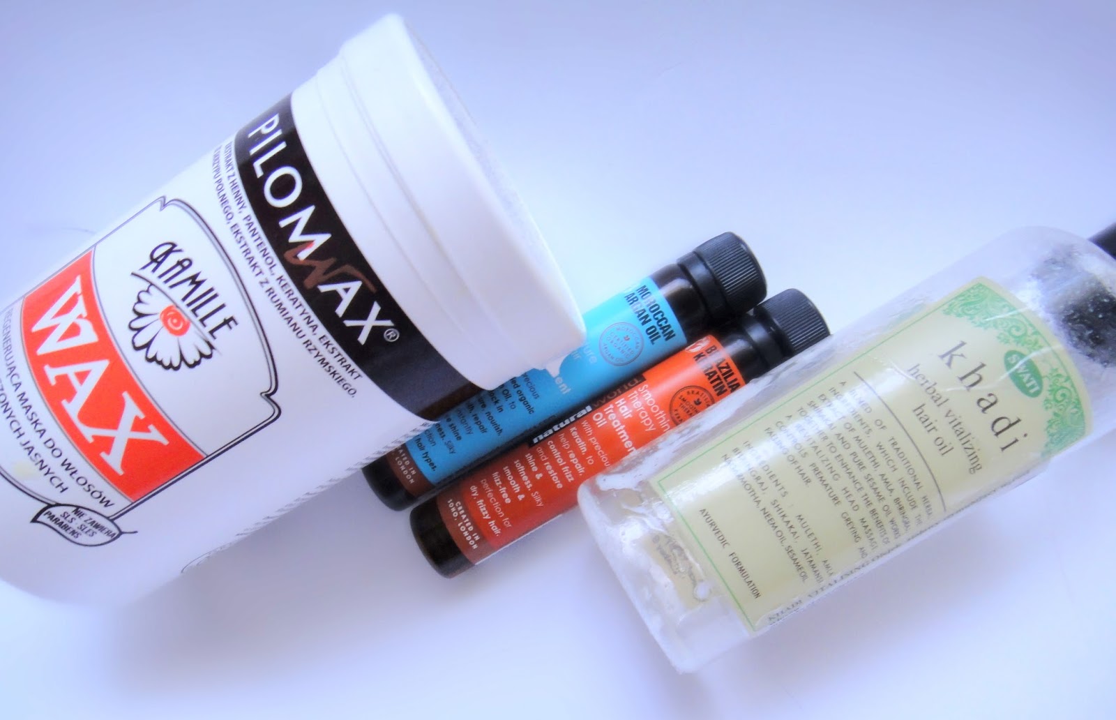 Zaraz za standardową pielęgnacją szamponowo-odżywkową stoją oczywiście maski i oleje, bez których obecnie również nie wyobrażam sobie dbania o moje włosy szczególnie po farbowaniu. Odnowę rozpoczęłam od ścięcia końcówek, które już dawno się oto prosiły, a następnie ponownie zaczęłam kontynuować olejowanie włosów, szczególnie końcówek przynajmniej raz w tygodniu dlatego, ze czasami ciężko znaleźć na to czas. Jeżeli już nakładam olej to zazwyczaj na całą noc lub ok. 2 godzin przed myciem. Najlepszym jak dotąd olejkiem okazał się Naturalworld Brazilian Keratin! Włosy wydają się być gładkie już chwilę po jego nałożeniu co później również nadaje ładny efekt odżywienia po odczekaniu kilku godzin i zmyciu. Alternatywą, którą również stosuję są produkty KHADI, olejki wygładzające oraz przyspieszające wzrost włosów. Obok olejów oczywiście co jakiś czas dobrze jest także zregenerować włosy odżywczą maską. Nakładając produkt tj. Pilomax dla włosów blond (są również dostępne maski dla ciemnych włosów) nie tylko odświeżają kolor ale i wygładzają włosy ułatwiając rozczesywanie i ich układanie. Maski jak i oleje owijam polarowym turbanem.